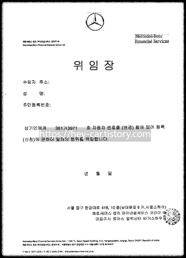 • 위임장: 리스사에서 차량 소유주를 대신하여 번호판 재발급을 위임한다는 내용의 서류입니다. 인감도장 날인이 되어 있어야 합니다.